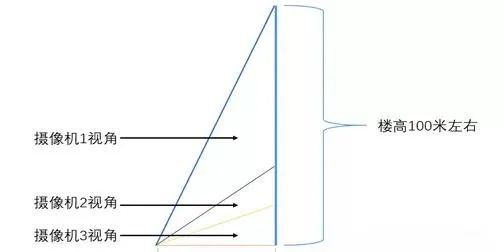 對于一個樓高在100米左右的大樓來說,可以通過3個相機進行覆蓋,一個攝像機照0—15米的高度,一個攝像機照15-30米的高度,一個攝像機覆蓋30-100米的高度: