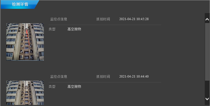 檢測詳情可看到詳細抓拍時間,識別“高空拋物”軌跡,實現實時追溯↓↓